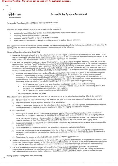 (8) The fuel savings in the teachers' homes are not included in the calculation of financial savings for the school. Although teachers are asked to make a small contribution each term (FJD70) for their now 24-hour power and this goes to the school to buy more education resources.